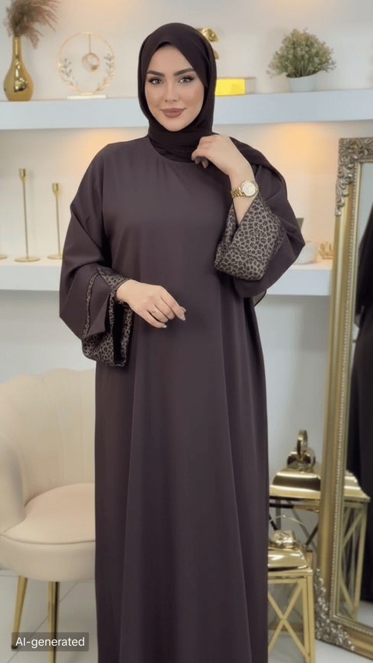 نقشة التايجر (Animal Print) الراقية: تتميز الأكمام ونهاية الخمار بلمسات من القماش المنقوش برسومات جلد النمر المتداخلة، مما يضفي لمسة من القوة والجاذبية على إطلالتك.